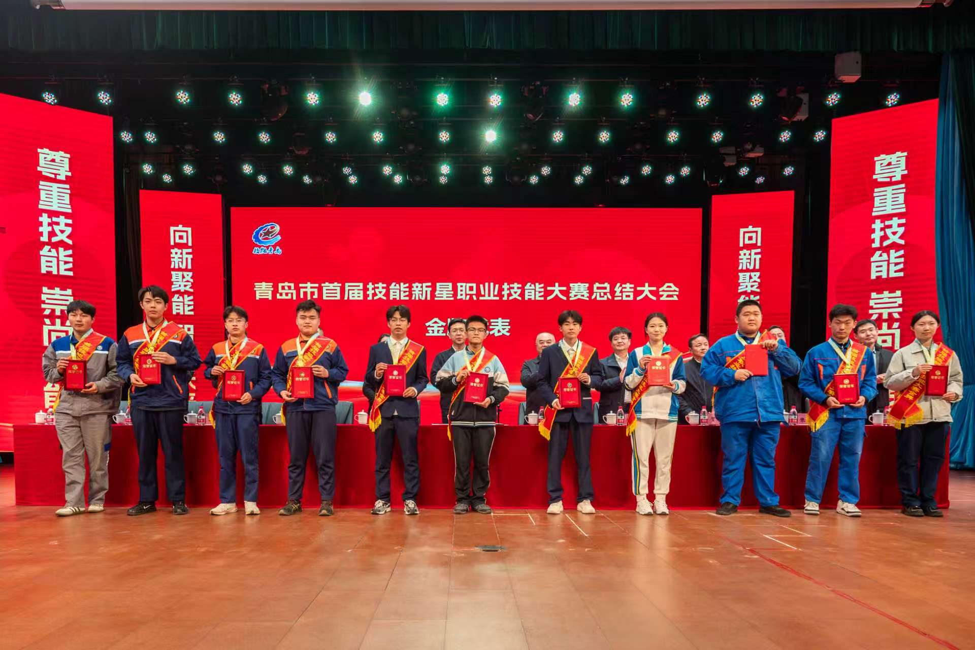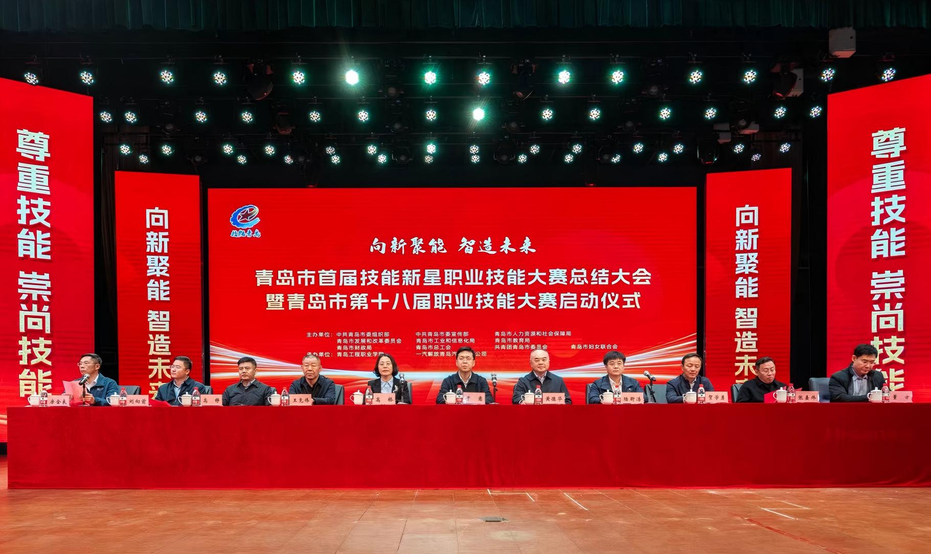 活动分两阶段举行,第一阶段为青岛市首届技能新星职业技能大赛总结大会,与会领导们为首届技能新星大赛获奖选手、优秀指导教师及“青岛市技能新星”获得者颁发了奖牌和荣誉证书,获奖人员代表作交流发言。第二阶段青岛市第十八届职业技能大赛启动仪式上,首批赛项承办单位青岛工程职业学院及链主企业代表一汽解放青岛汽车有限公司相关负责同志分别作表态发言,参赛选手和裁判员代表进行了庄严宣誓,于局长发表致辞并宣布开赛。