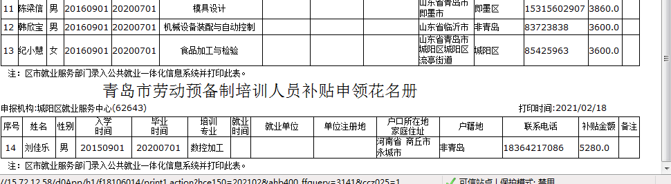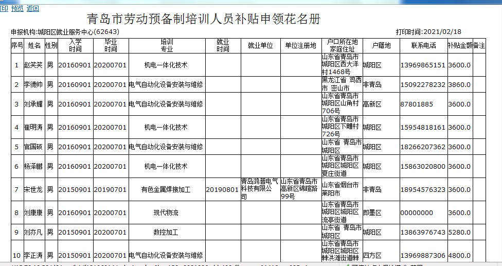 根据青岛市人力资源和社会保障局《关于做好劳动预备制培训有关问题的通知》(青人社规 〔2019 〕 9 号)中劳动预备制培训有关规定,经初步审核,拟批准青岛市城阳区就业服务中心宋世龙等14名人员的培训、鉴定费补贴申请。现将有关情况予以公示(详见附表)。本公示期为5个工作日,自2021年2月18日起至2021年2月23日止,公示期内,如发现与公示内容不符或存在不能享受政府培训补贴的现象,请予以监督举报。2021年第二批劳动预备制补贴花名册1第二批劳动预备制补贴花名册2